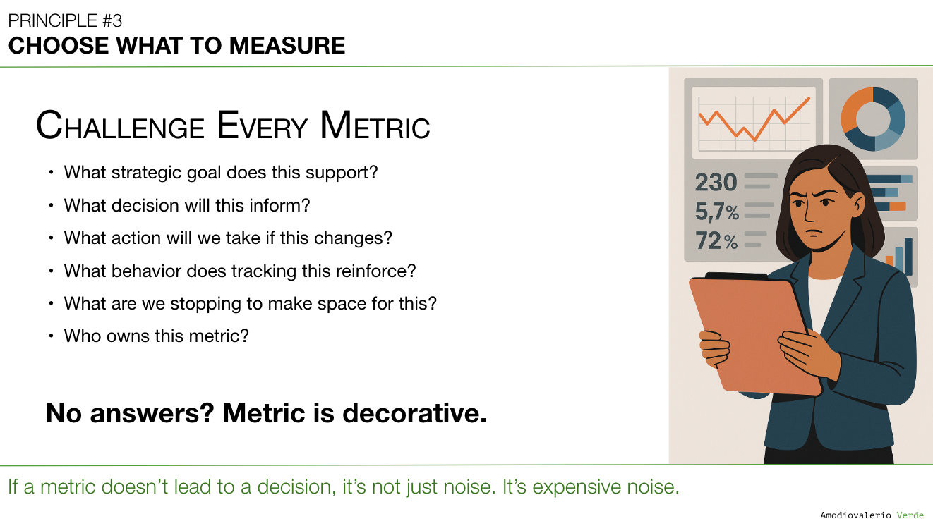 Retiring metrics is as important as adding them. Each metric consumes team focus and implies importance. Retained irrelevant metrics signal false priorities and create decision inertia. The question isn't “Can we track it?” but “What happens if we stop tracking it?” If the answer is “Nothing,” it’s noise.