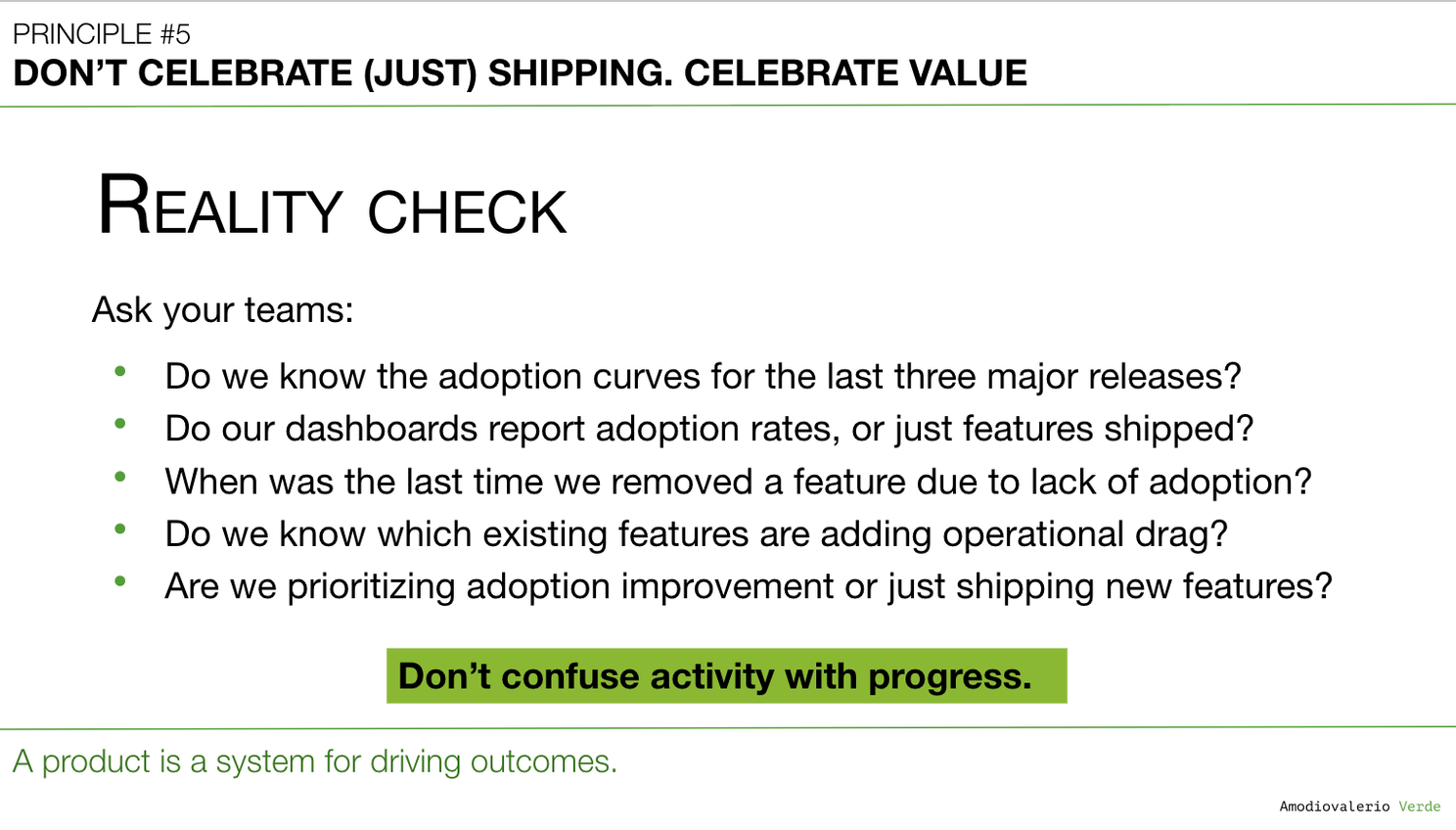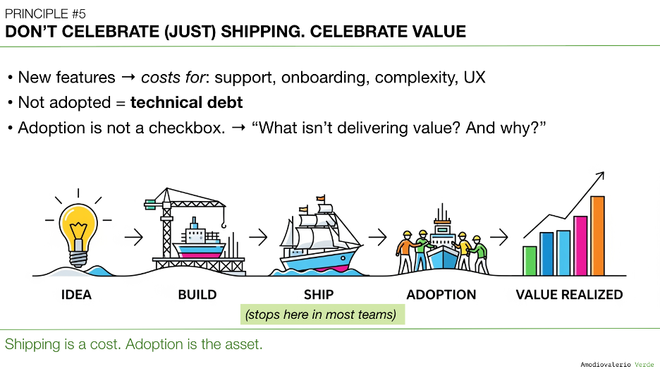 Now, in Principle 5, we confront a deeper trap: mistaking shipping for success. Because features aren’t value. Adoption is.