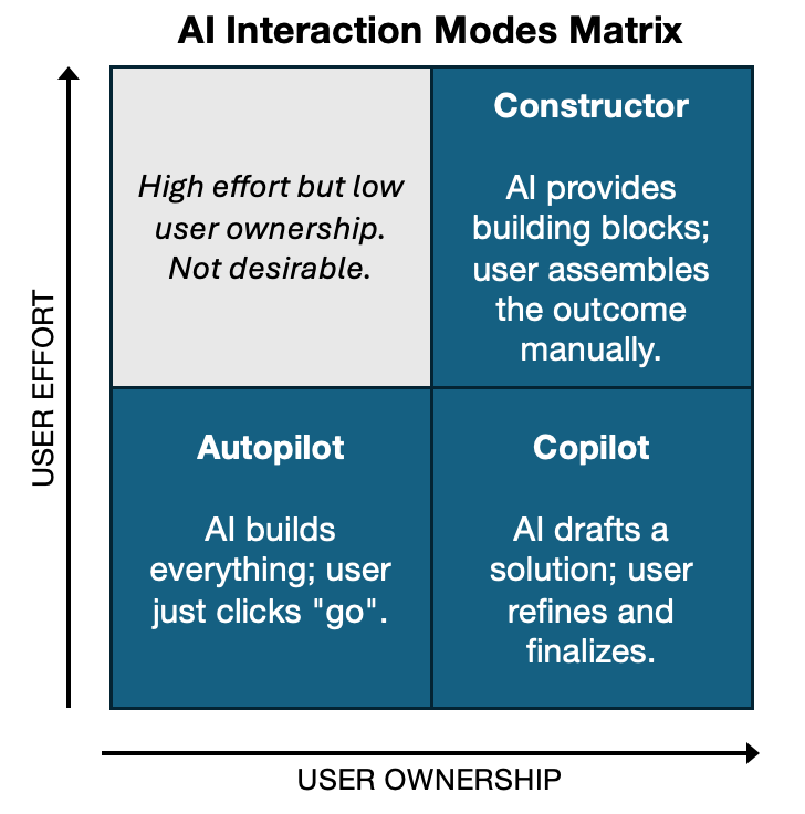 - Constructor: AI provides components. Users assemble the solution. Highest ownership, strongest attachment.