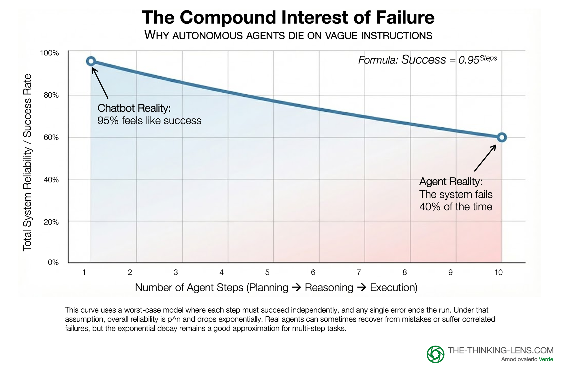In a simple chatbot, a 1% misunderstanding rate is an annoyance. But Agents operate in loops: planning, reasoning, executing, and verifying. If your instruction has a 1% margin of error, that error compounds with every step the Agent takes. At 95% accuracy per step, by step 10, the system collapses to a 60% success rate.