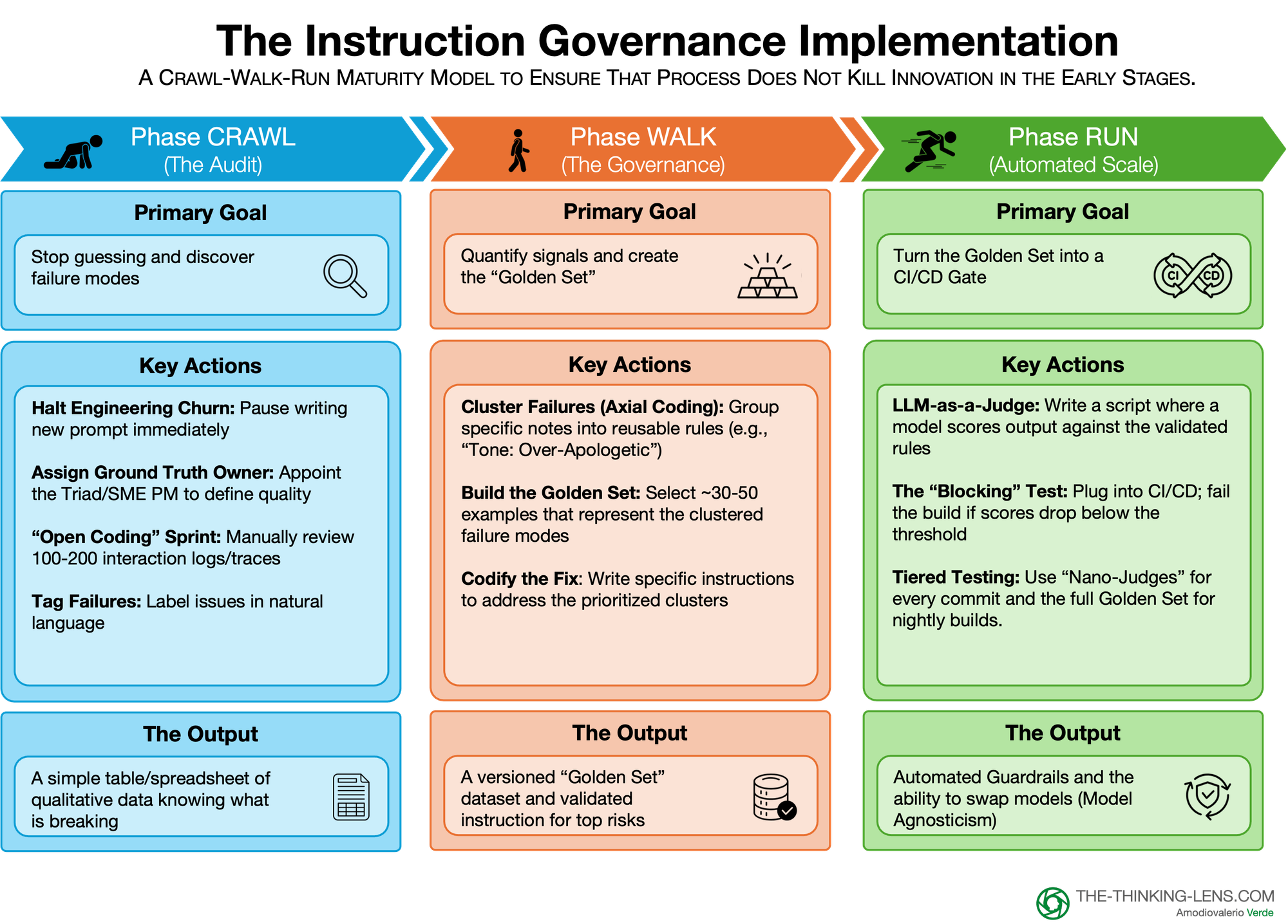 As products, teams, and markets multiply, risks compound. Moving from one pilot to ten products or from 100 users to a million customers is the point where you need real Instruction Governance, not just good intentions. That is when the full Triad, federated Golden Sets, and CI/CD gates become non-negotiable.