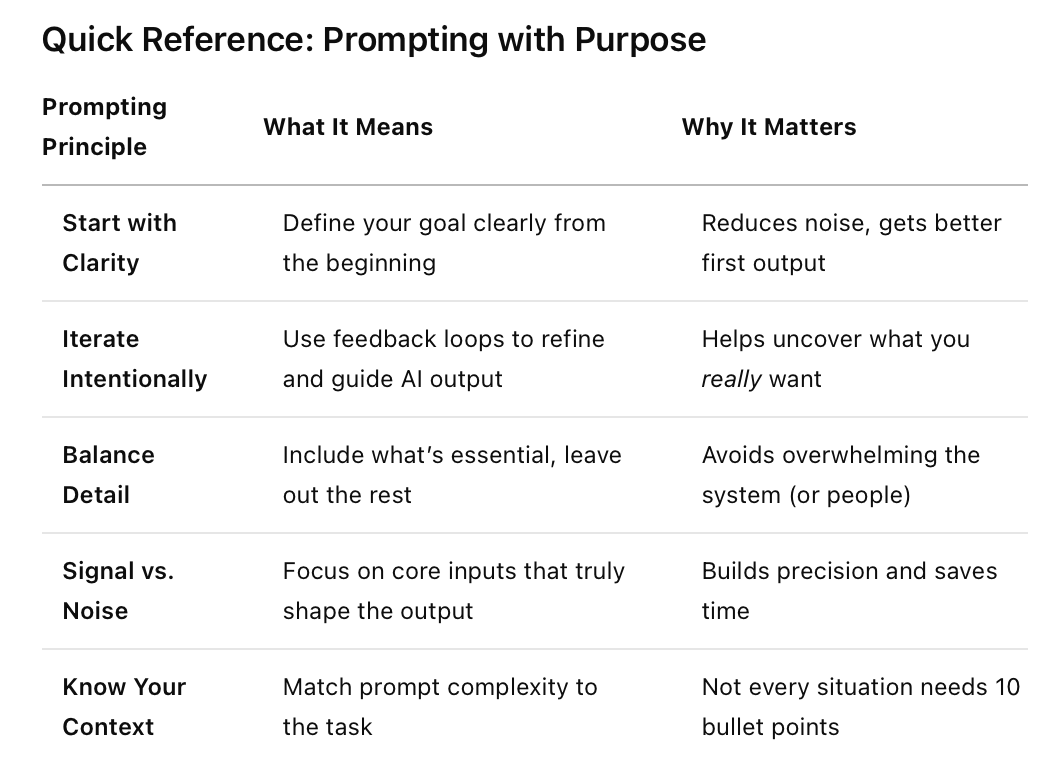 Similarly, when prompting AI, focus on the key parameters, desired outcomes, and constraints. Avoid overloading with noise. The goal is to strike a balance: enough precision to guide the system, but enough brevity to keep the signal strong.