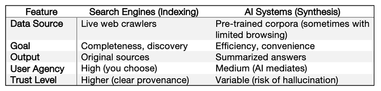 - Transparency: A core function of an indexing system is to return links to original sources with minimal interpretation, showing clear provenance for its information. This allows you to see the source for yourself when trust is critical. Synthesis engines, conversely, often deliver a rephrased summary that can obscure the original source, introducing a layer of mediation and potentially hiding what information was filtered out in the name of convenience.