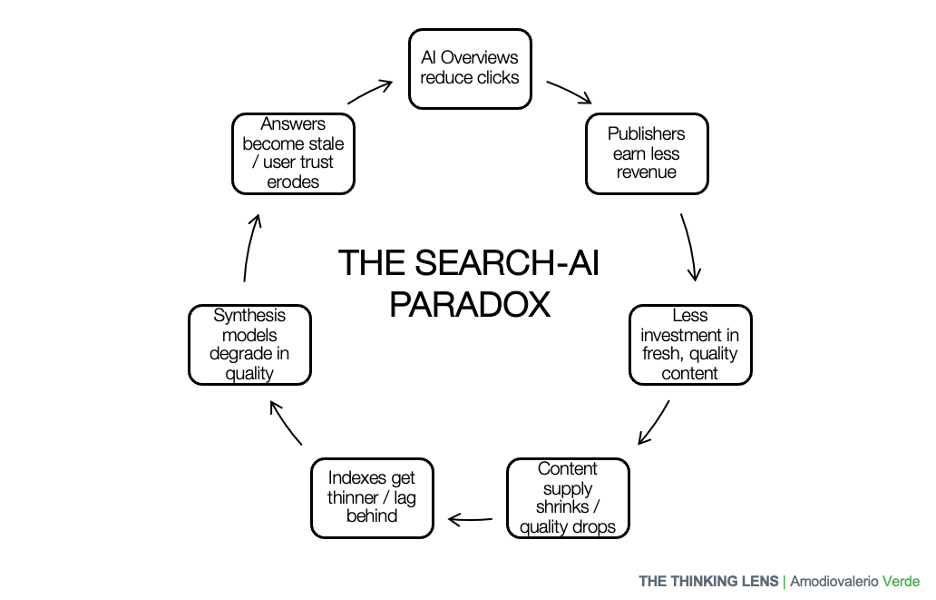 Then synthesis engines suffer too. Without robust indexes feeding them, AI systems risk becoming parrots trained on stale data. This is the paradox: the more synthesis draws clicks away from search, the more it undermines the freshness it depends on.