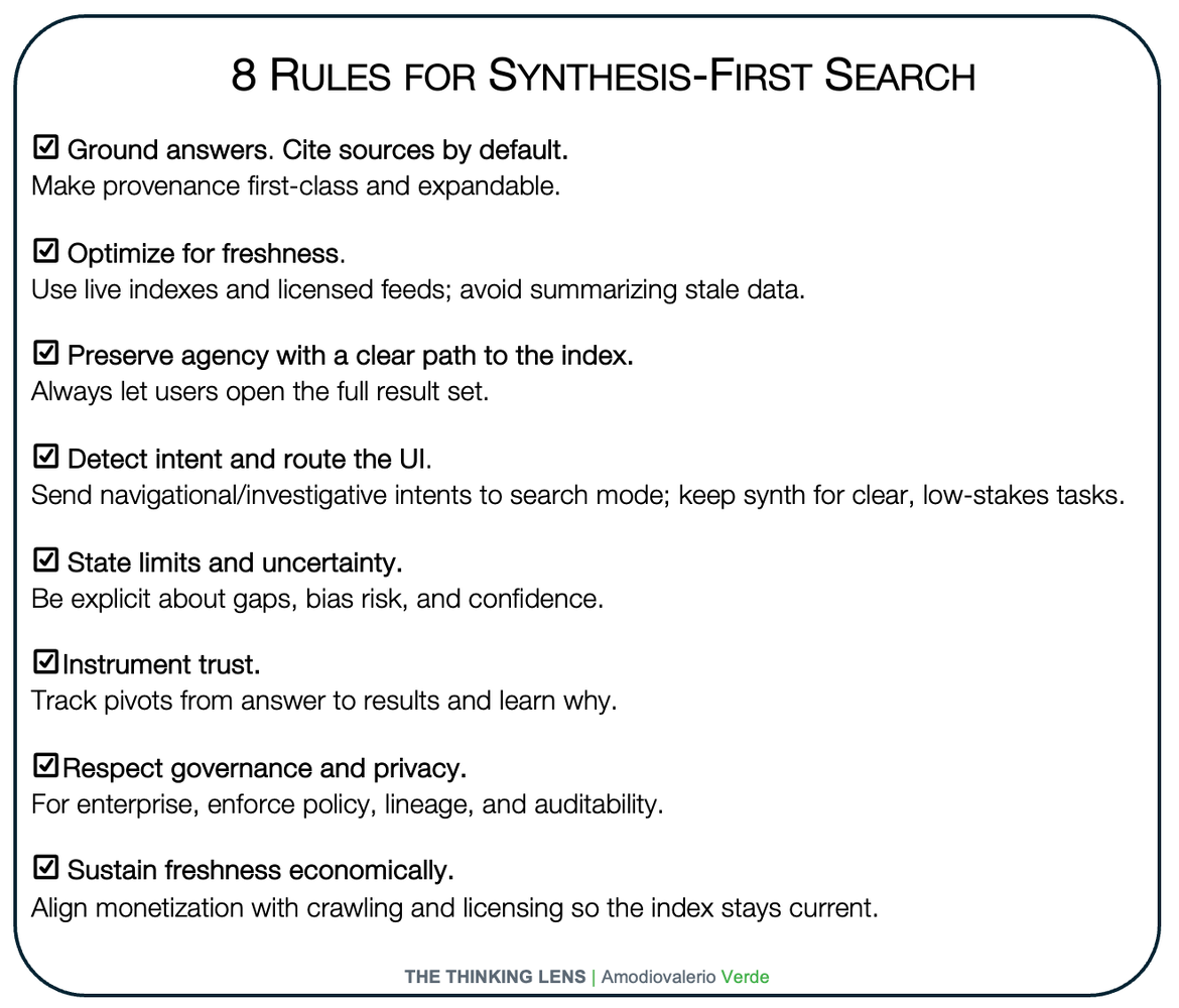 Design for a hybrid model. Provide unmediated discovery when users need transparency and provenance, and synthesis when they need speed and convenience. The strongest products will allow users to move fluidly between both modes.