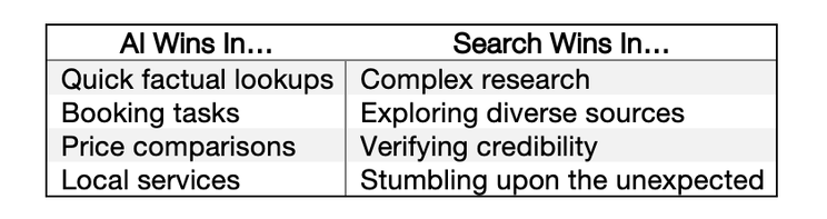 Here’s the twist: The real threat of AI isn’t to general search. It’s to verticals where synthesis beats browsing.