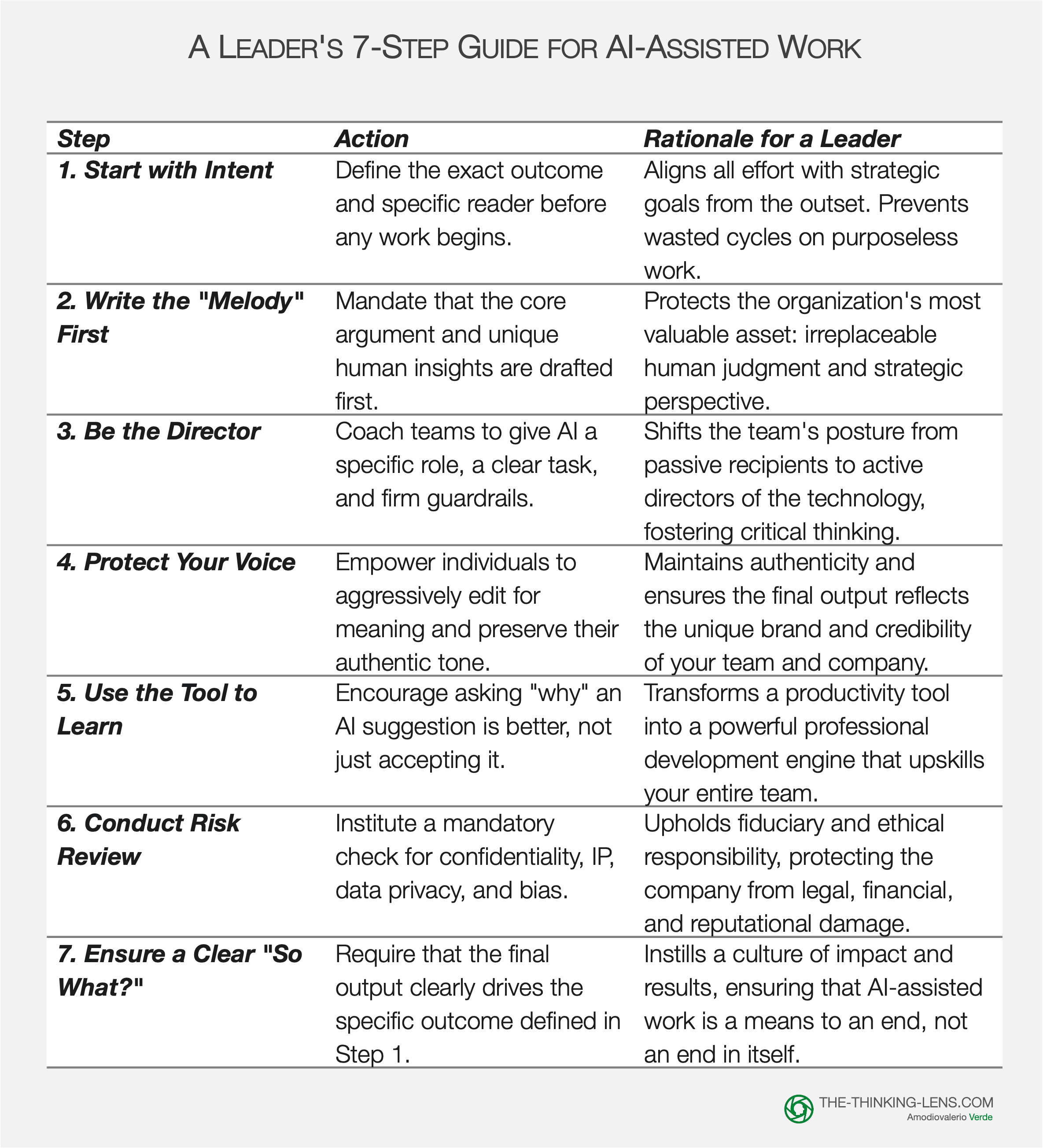 I've developed this 7-step guide for leaders to operationalize these ideas. It's a practical framework to help your teams move beyond "Polished Emptiness" and use AI to amplify thinking, not just polish. It provides clear actions to protect the "melody" and ensure AI serves your strategy – not the other way around.