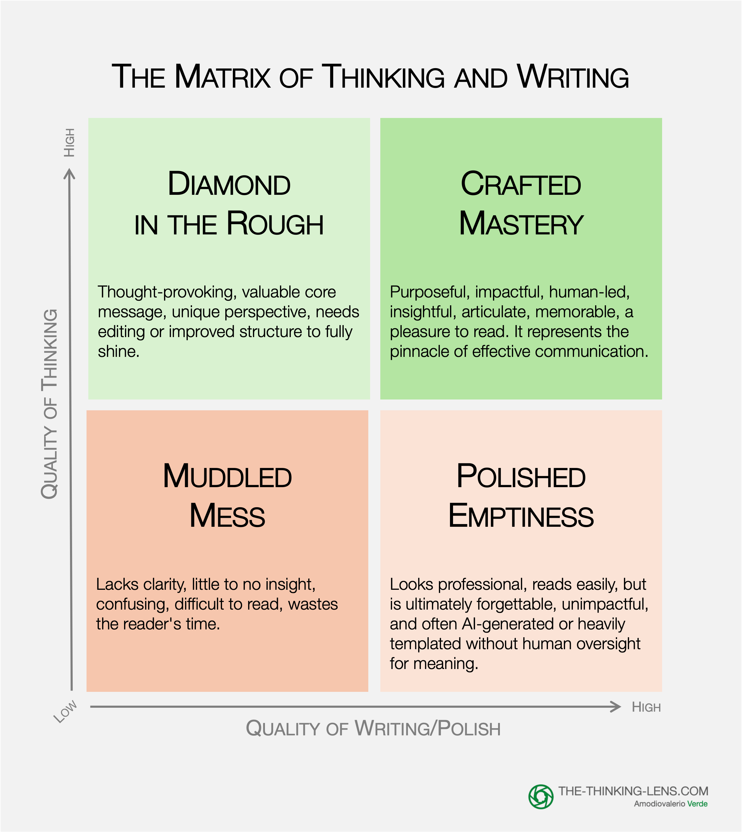 This simple map plots quality of thinking against quality of polish to reveal four states, from Muddled Mess to Crafted Mastery. Use it to self-diagnose your draft and decide the next move.