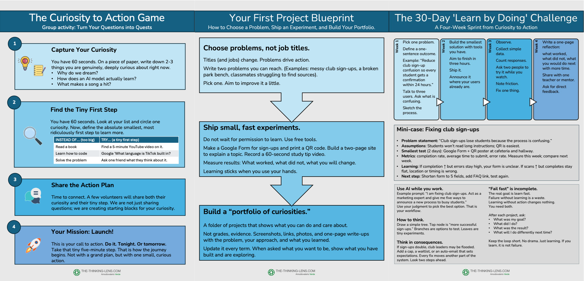 So, I've prepared a simple toolkit for you. It's a set of game plans to help you turn curiosity into action. For example, there's a 30-day challenge to take a problem like 'club sign-ups are confusing' and turn it into a real solution. Let’s have a look.